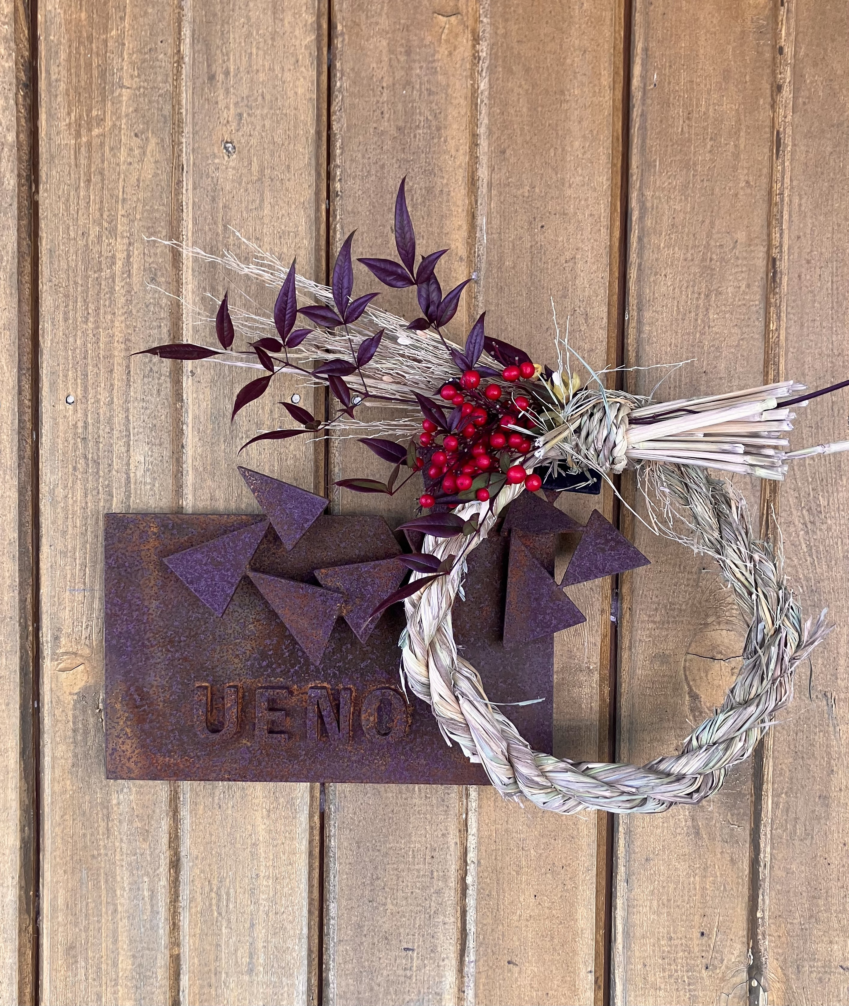 今年収穫した餅米の稲藁でしめ縄を作り表札にマグネットで飾りました。